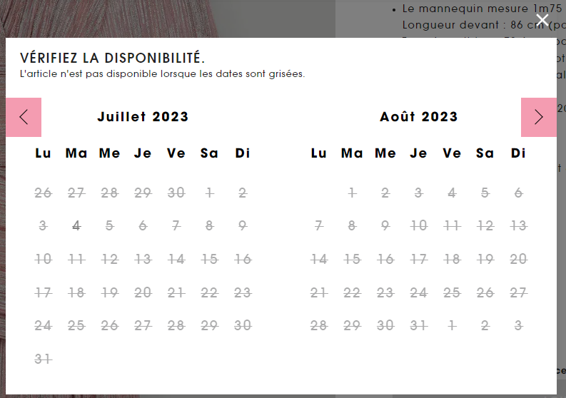 - Brief Explanation Text: Single Product > Availability Checker > Availability Checker Modal Description. For example: "The item is not available when the dates are grayed out."